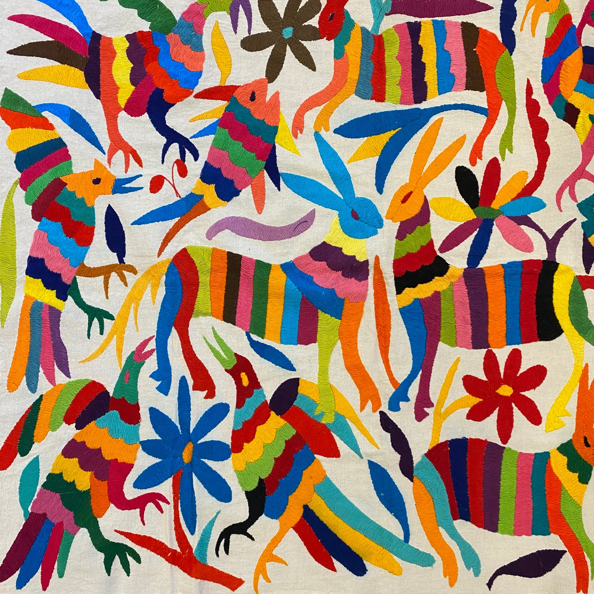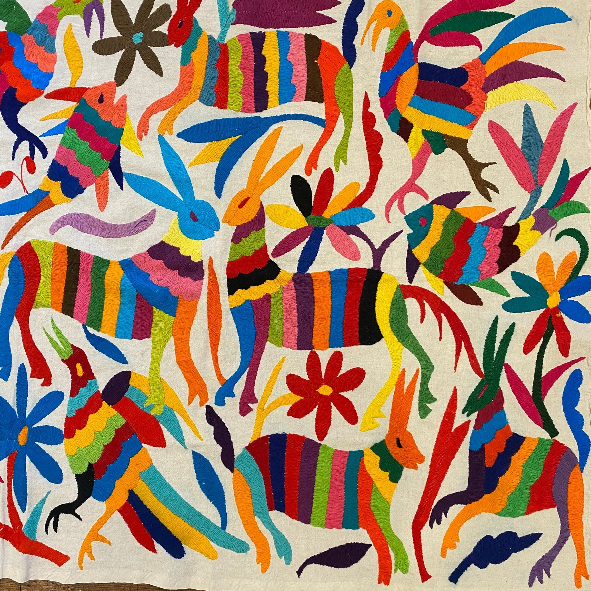 Hand embroidered by the Otomis in central plateau of Mexico, these table runners feature fantastic animals, insects, and flowers. This type of embroidery on cotton is highly coveted by lovers of Mexican art for their exuberant colors and highly imaginative design. Popularly called "Otomi" after their creators, no two embroideries are alike and can take months to finish. Please keep in mind that each piece is handmade and unique and can vary in size and design.