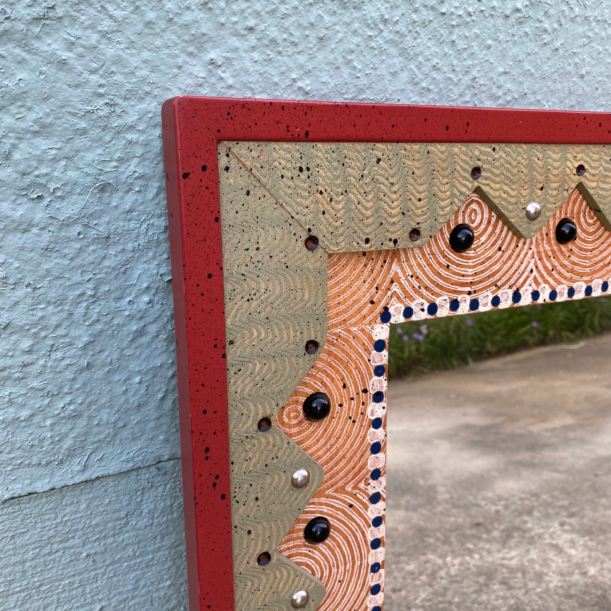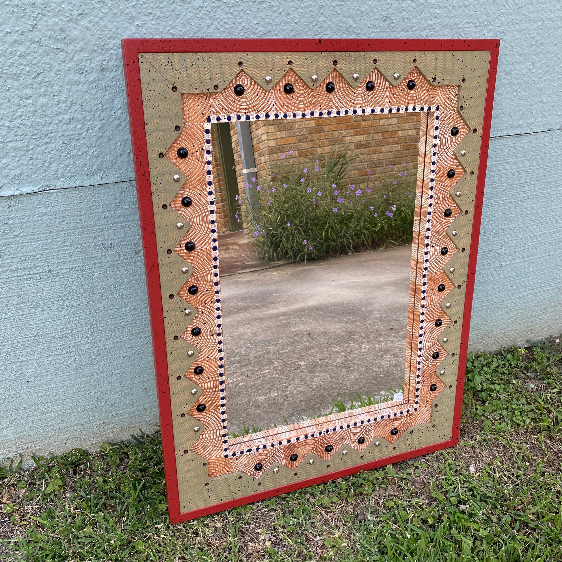 Each piece of David Marsh furniture is handcrafted at the studio of local artist David Marsh here in Houston, TX. All David Marsh furniture is crafted from yellow pine and has a very sturdy polyurethane finish making the furniture great for everyday use. The pattern of this mirror is called Marbleous and Tacky because David Marsh whimsically uses a zig zag cut and marbles and tacks to add a fun flare to the mirror. It is 26" x 34".