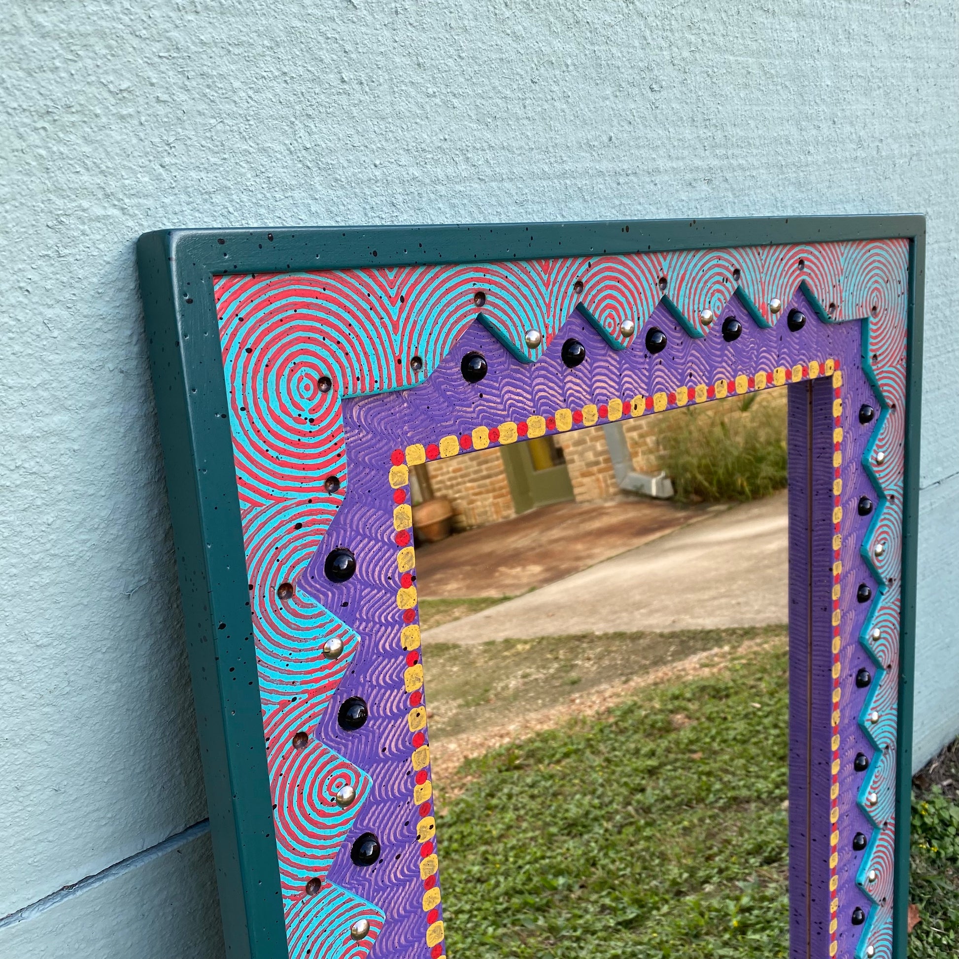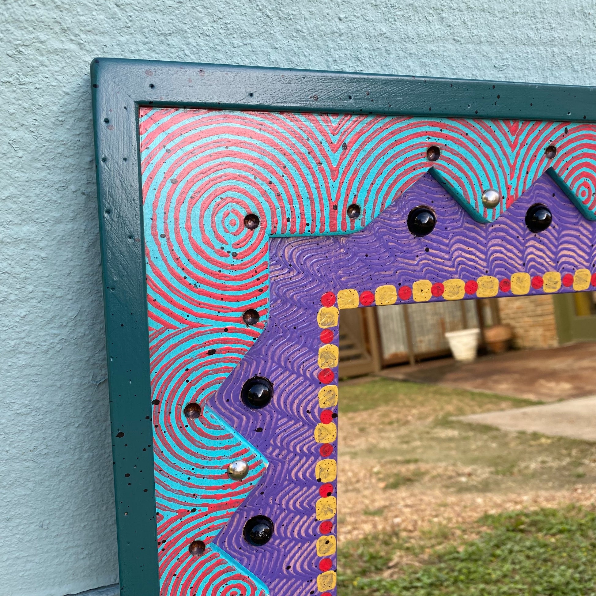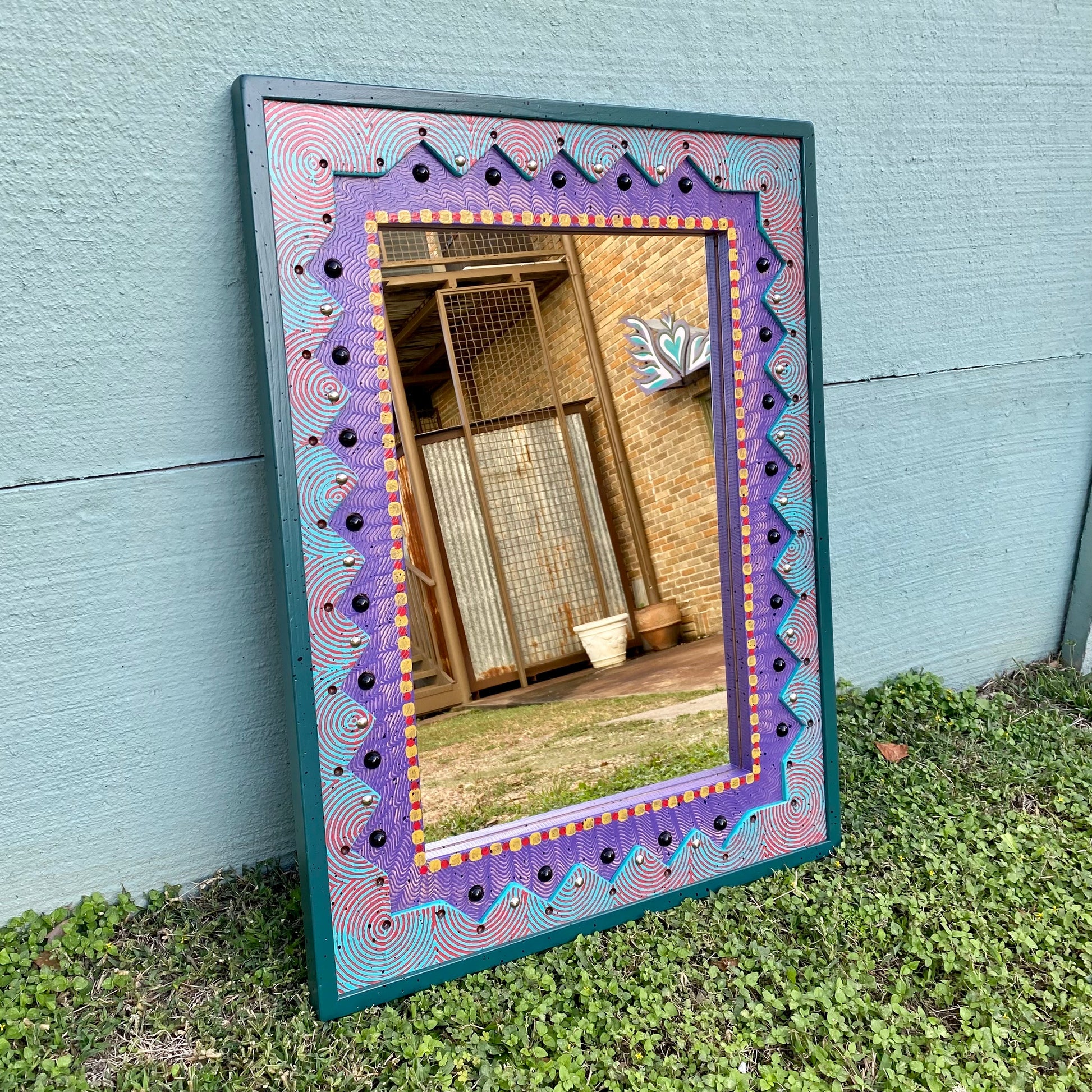 Each piece of David Marsh furniture is handcrafted at the studio of local artist David Marsh here in Houston, TX. All David Marsh furniture is crafted from yellow pine and has a very sturdy polyurethane finish making the furniture great for everyday use. The pattern of this mirror is called Marbleous and Tacky because David Marsh whimsically uses a zig zag cut and marbles and tacks to add a fun flare to the mirror. It is 26" x 34".