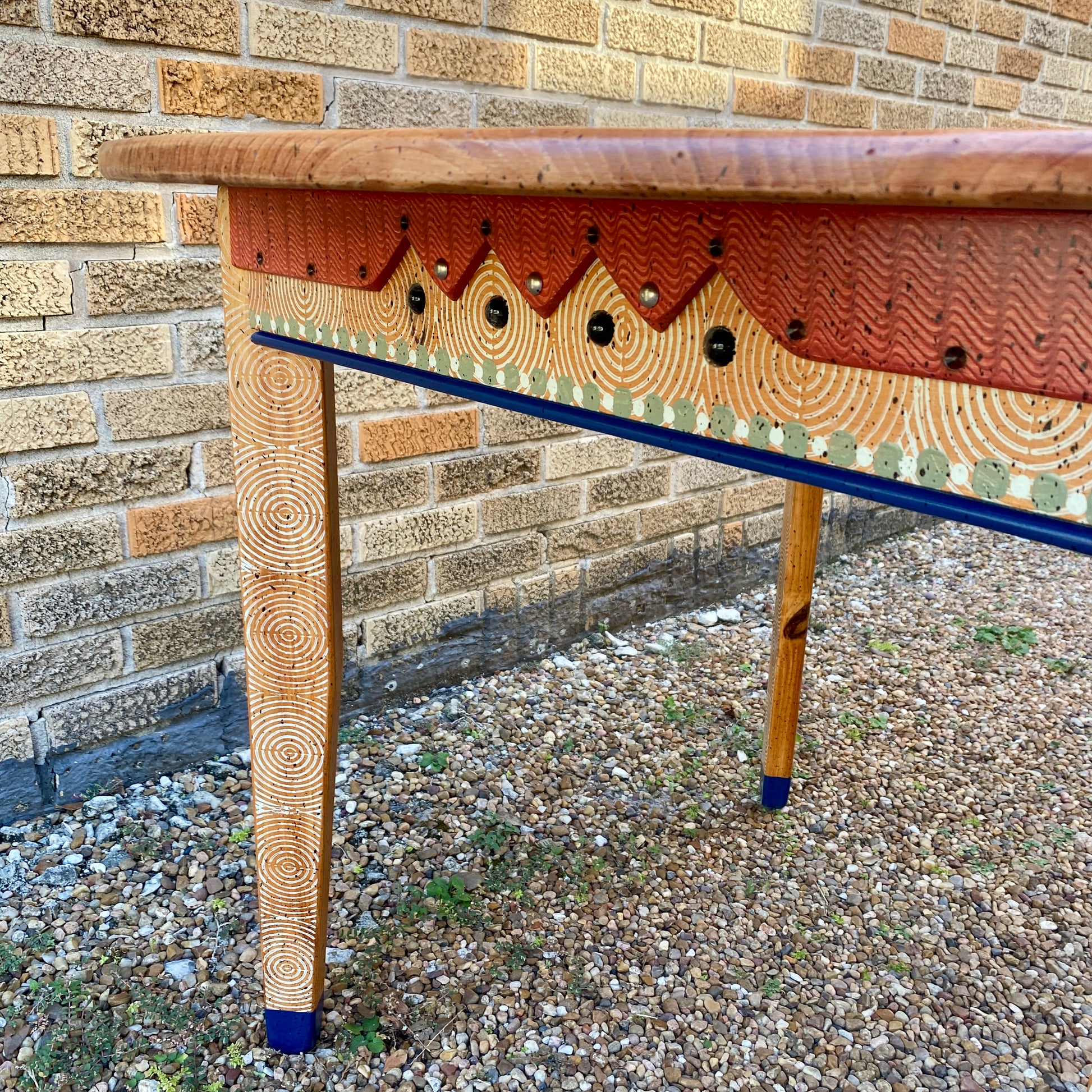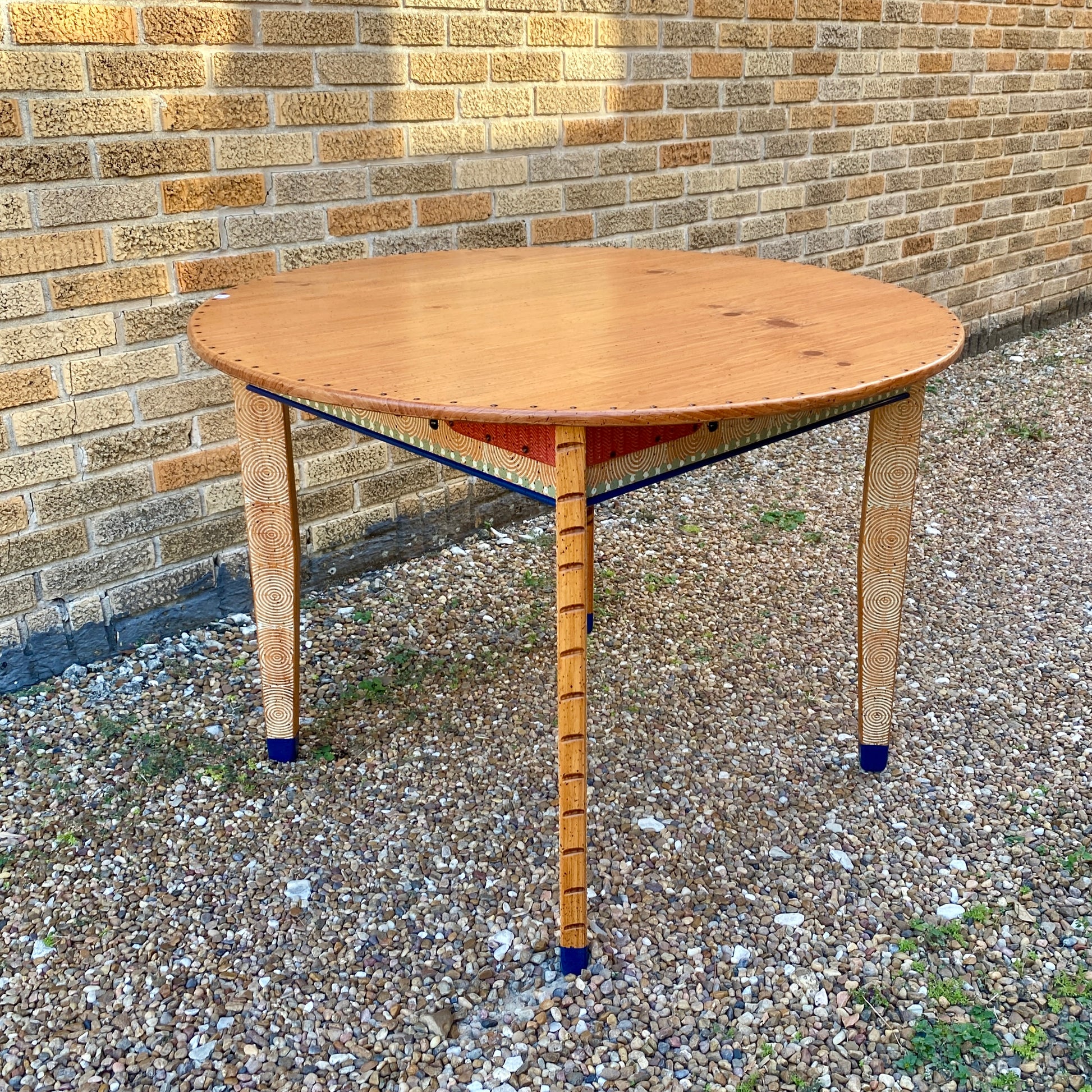 Each piece of David Marsh furniture is handcrafted at the studio of local artist David Marsh here in Houston, TX. All David Marsh furniture is crafted from yellow pine and has a very sturdy polyurethane finish making the furniture great for everyday use. This table is small and light weight so it can be easily moved around to suit your needs. 42” Round x 30” Tall.