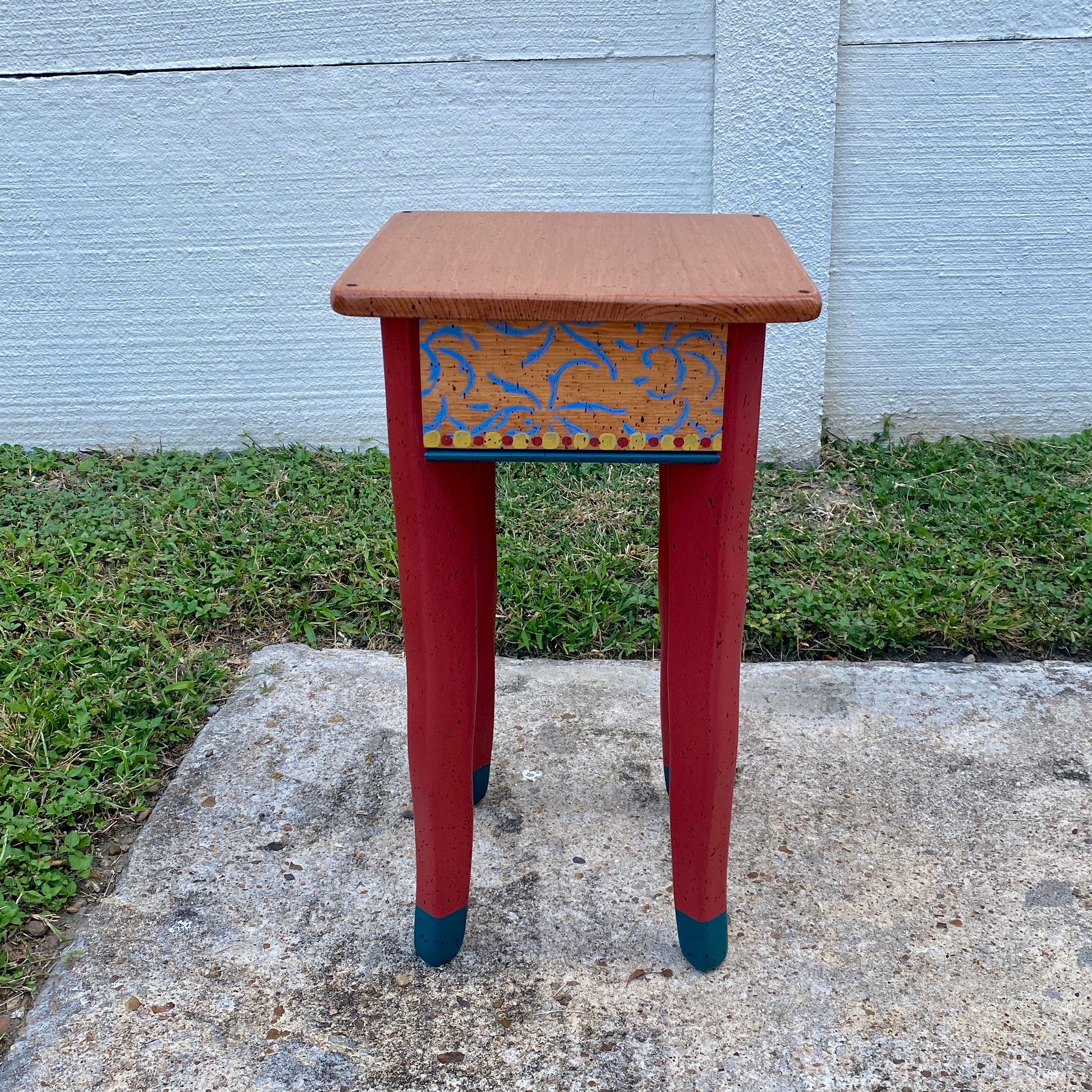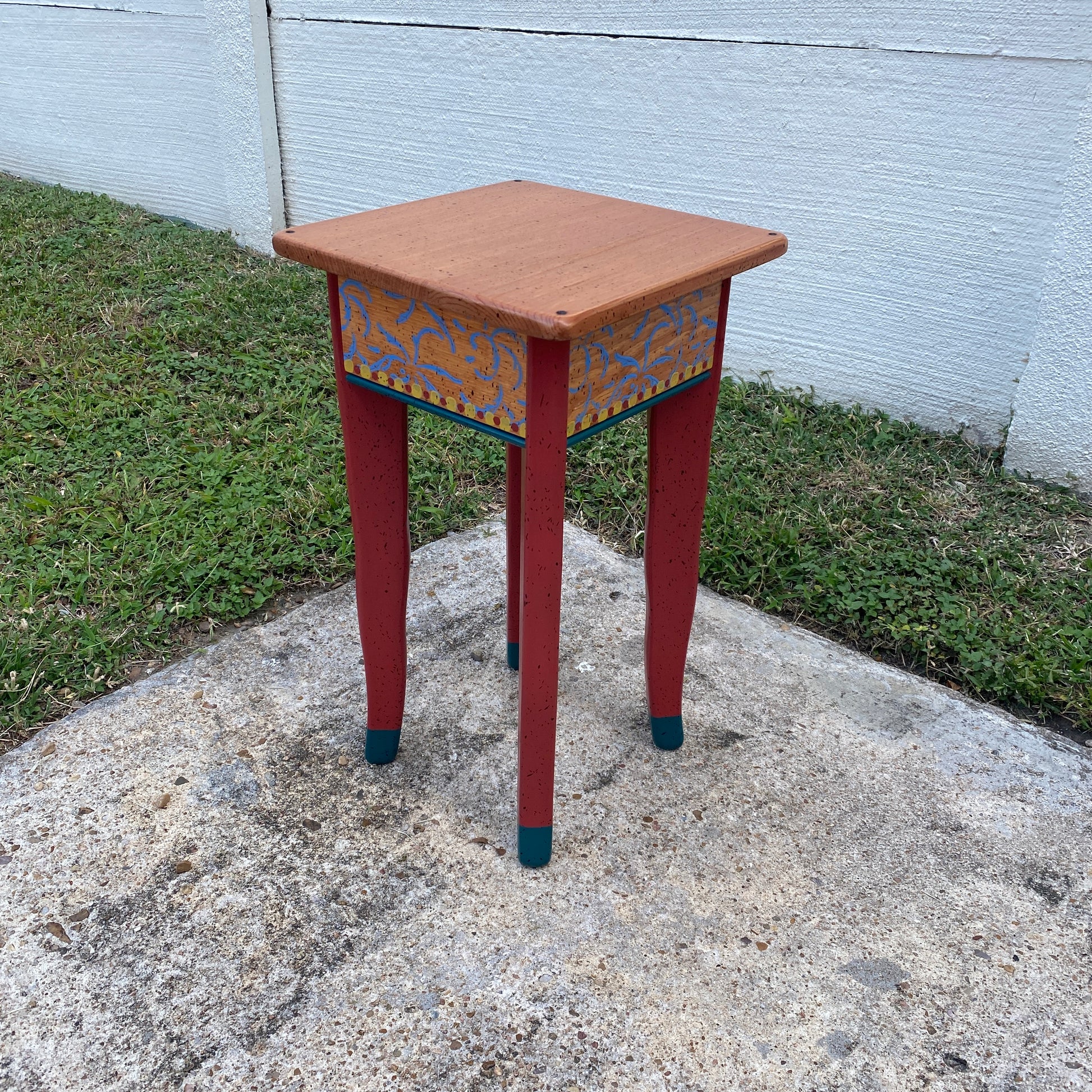 Each piece of David Marsh furniture is handcrafted at the studio of local artist David Marsh here in Houston, TX. All David Marsh furniture is crafted from yellow pine and has a very sturdy polyurethane finish making the furniture great for everyday use. This table is small and light weight so it can be easily moved around to suit your needs. 13” square x 23” tall.