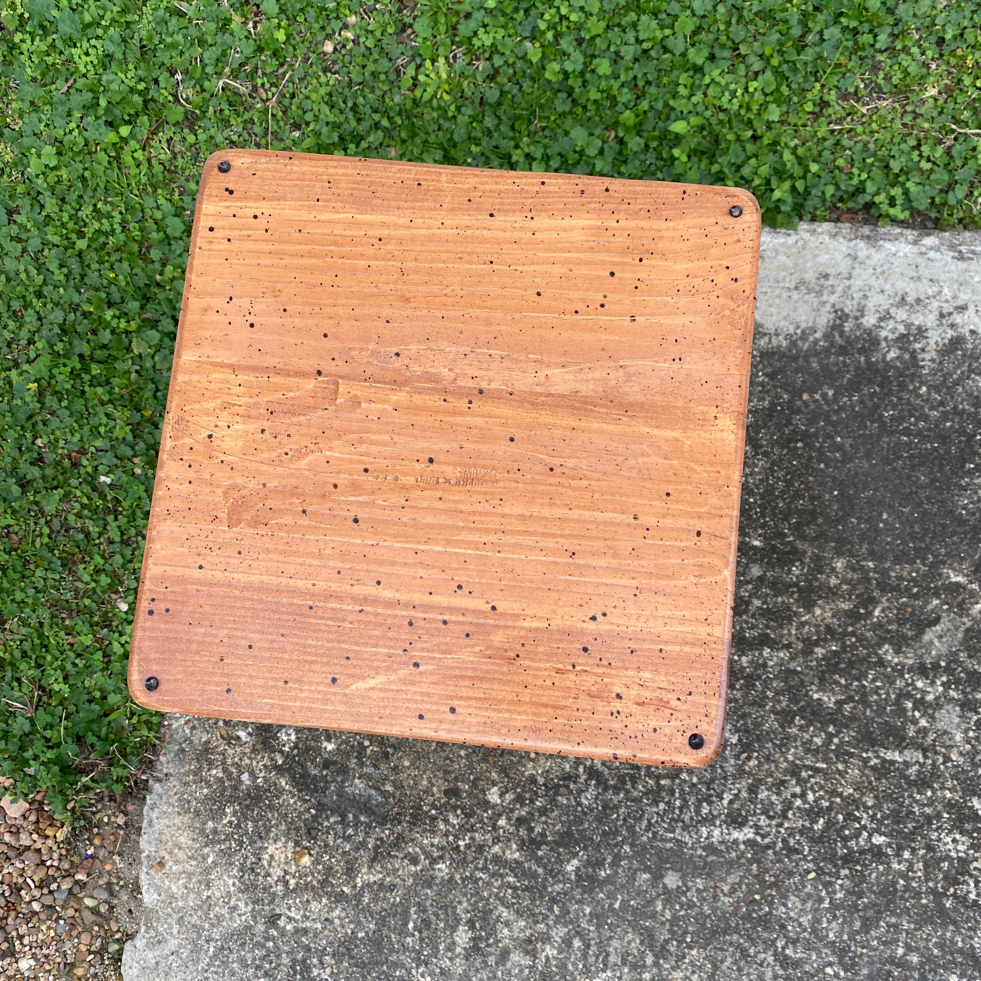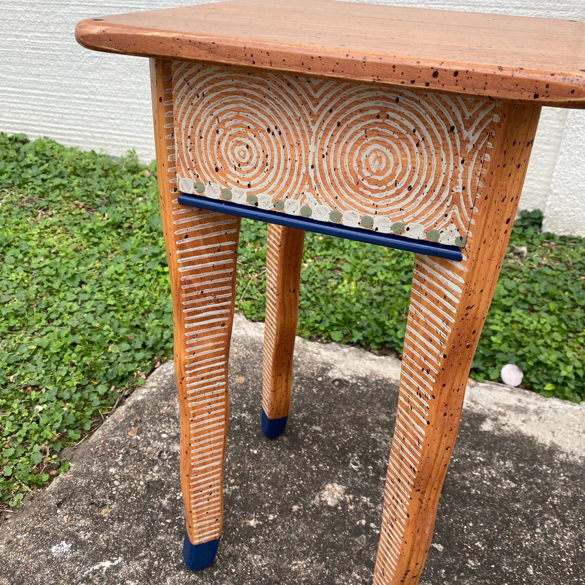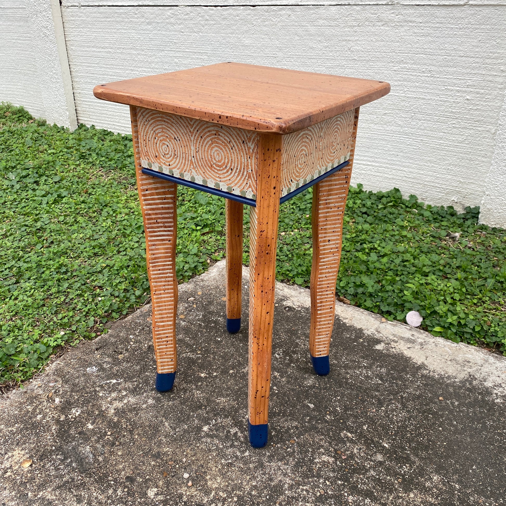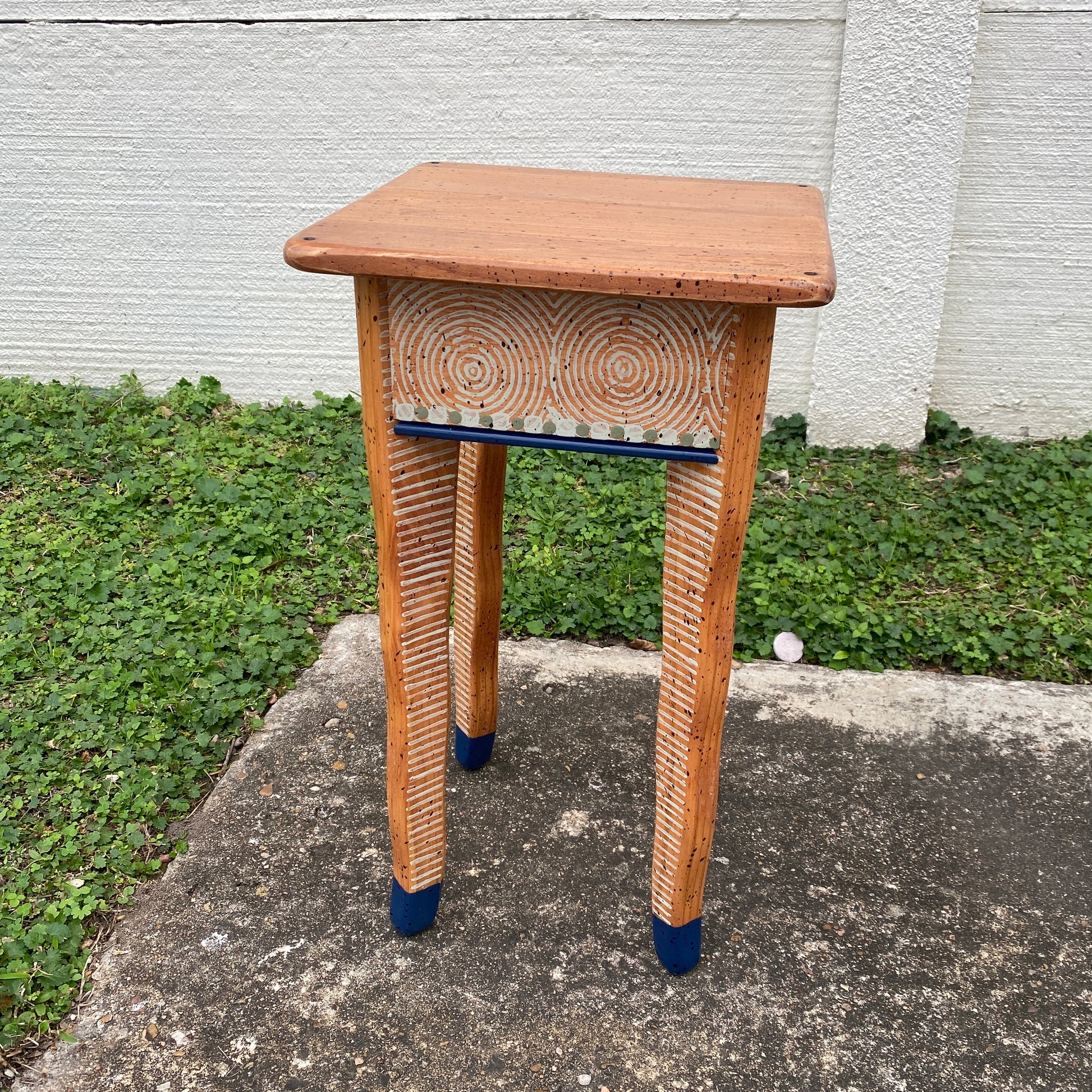 Each piece of David Marsh furniture is handcrafted at the studio of local artist David Marsh here in Houston, TX. All David Marsh furniture is crafted from yellow pine and has a very sturdy polyurethane finish making the furniture great for everyday use. This table is small and light weight so it can be easily moved around to suit your needs. 13” square x 23” tall.