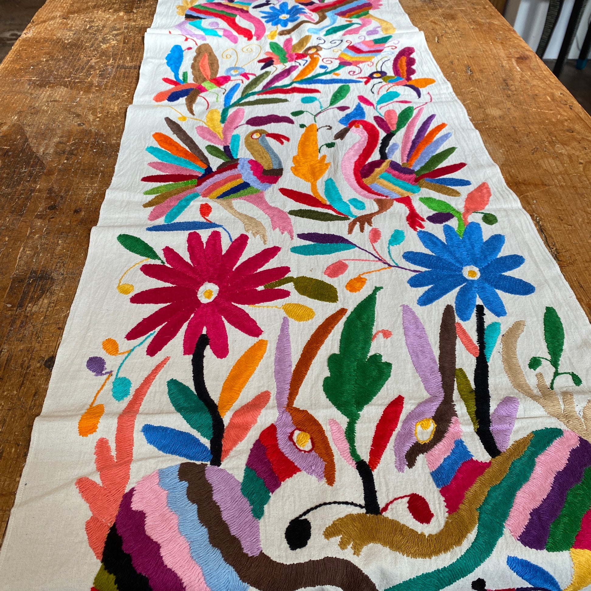 Hand embroidered by the Otomis in central plateau of Mexico, these table runners feature fantastic animals, insects, and flowers. This type of embroidery on cotton is highly coveted by lovers of Mexican art for their exuberant colors and highly imaginative design. Popularly called "Otomi" after their creators, no two embroideries are alike and can take months to finish. These table runners measure approximately 16" x 72". Please keep in mind that each runner is handmade and unique.
