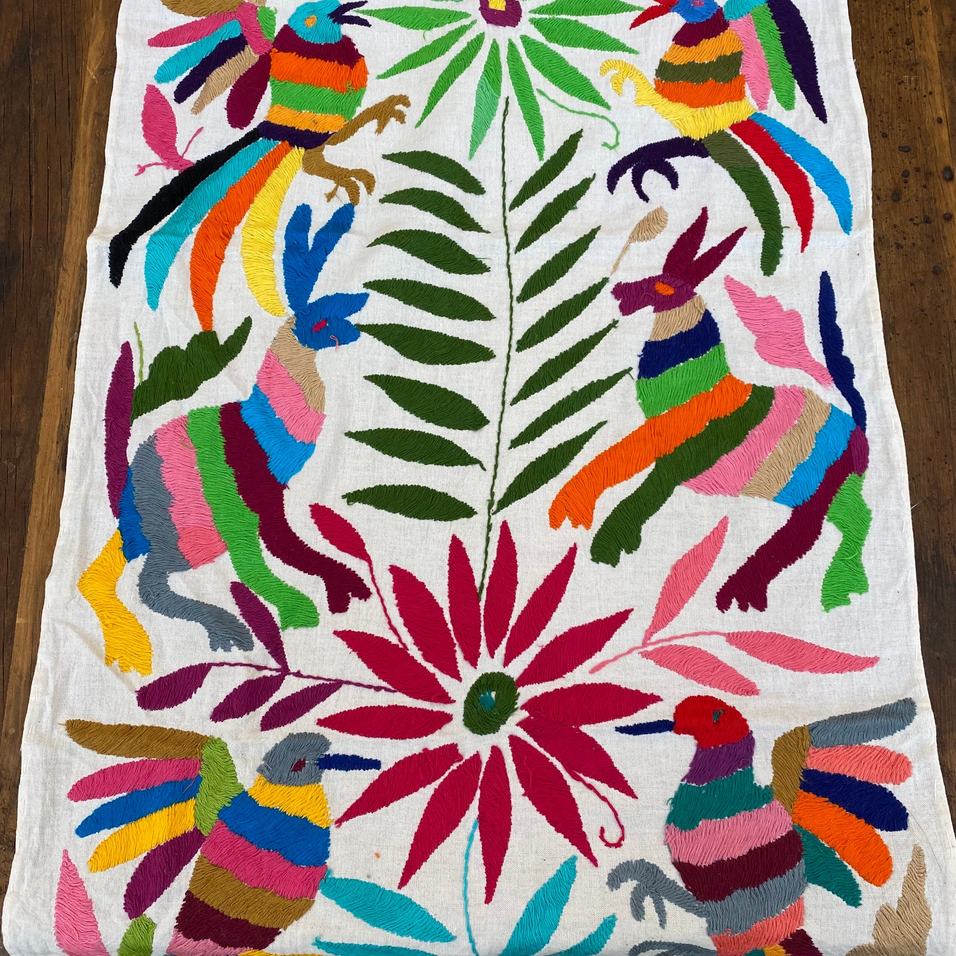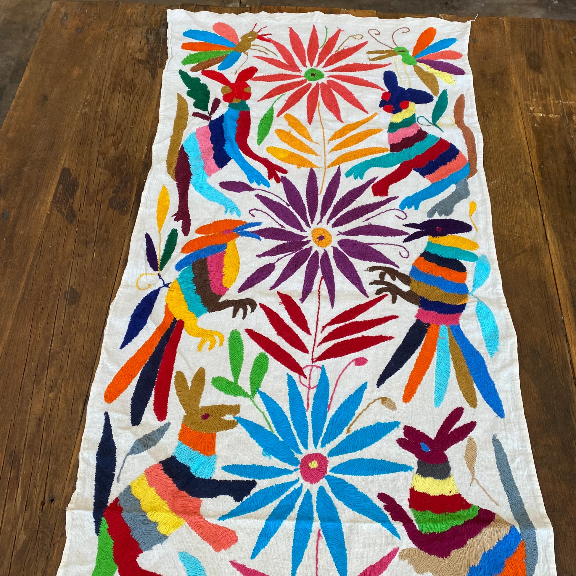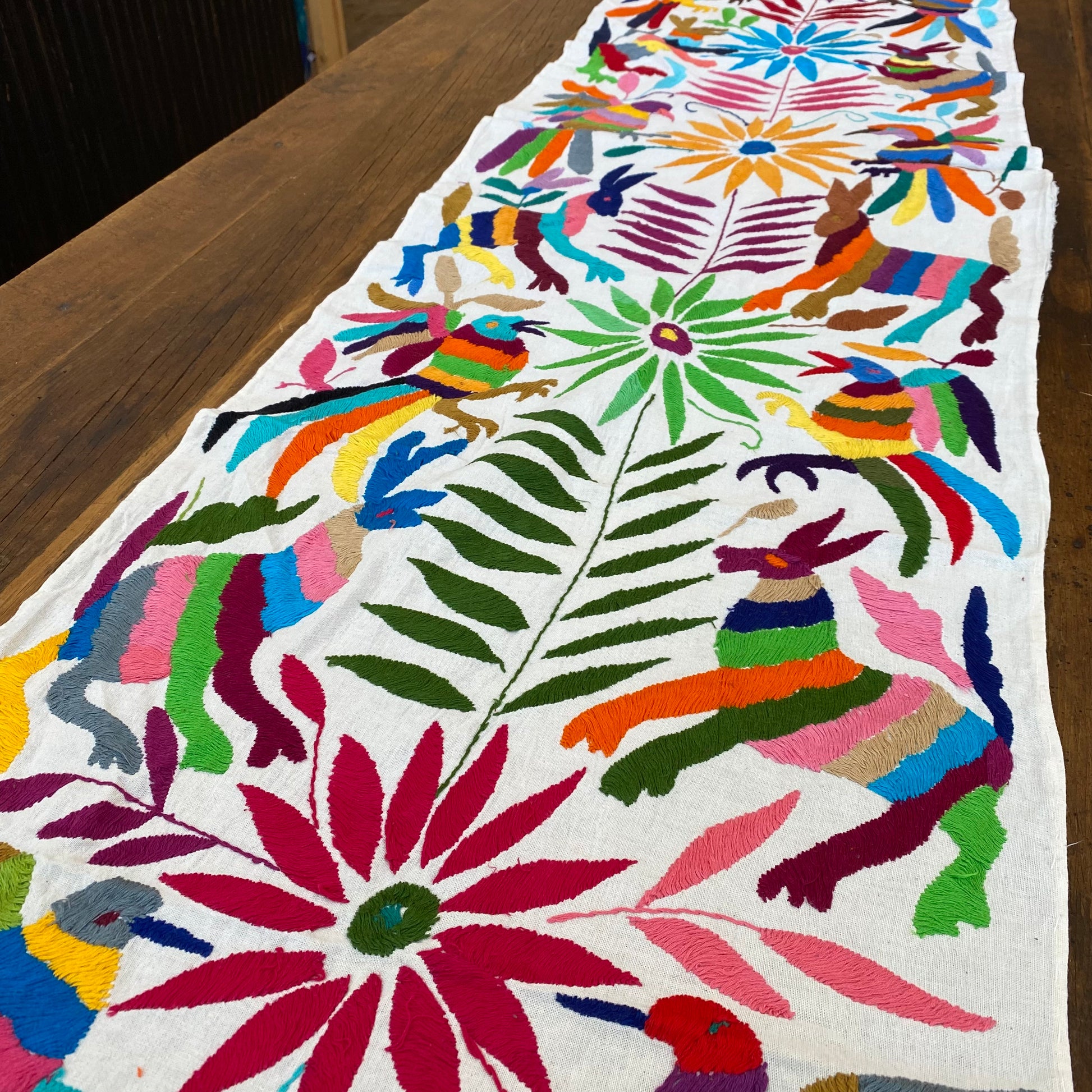Hand embroidered by the Otomis in central plateau of Mexico, these table runners feature fantastic animals, insects, and flowers. This type of embroidery on cotton is highly coveted by lovers of Mexican art for their exuberant colors and highly imaginative design. Popularly called "Otomi" after their creators, no two embroideries are alike and can take months to finish. These table runners measure approximately 16" x 72". Please keep in mind that each runner is handmade and unique and can vary in size and design.