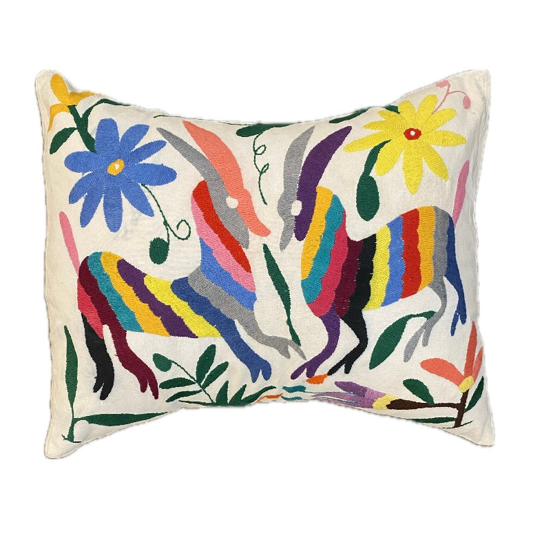 Hand embroidered by the Otomis in central plateau of Mexico, these pillows feature fantastic animals, insects, and flowers. This type of embroidery on cotton is highly coveted by lovers of Mexican art for their exuberant colors and highly imaginative design. Popularly called "Otomi" after their creators, no two embroideries are alike and can take months to finish.
