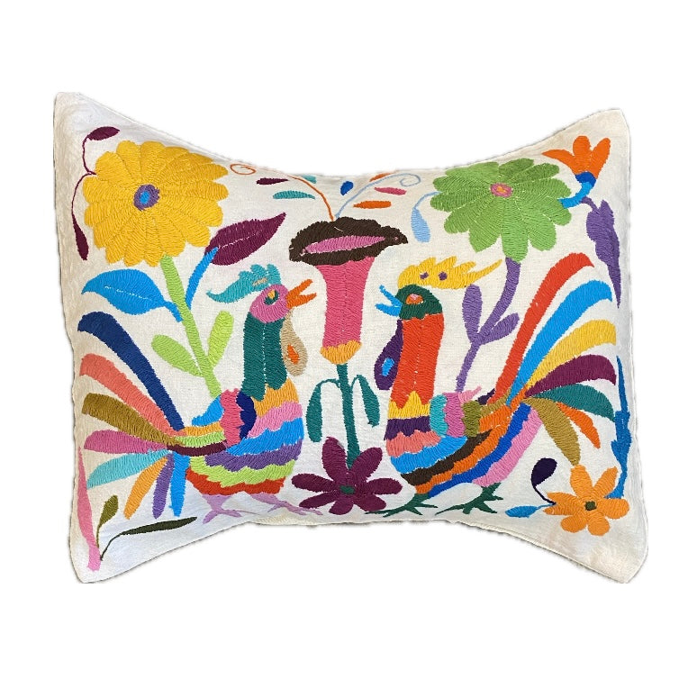 Hand embroidered by the Otomis in central plateau of Mexico, these pillows feature fantastic animals, insects, and flowers. This type of embroidery on cotton is highly coveted by lovers of Mexican art for their exuberant colors and highly imaginative design. Popularly called "Otomi" after their creators, no two embroideries are alike and can take months to finish.