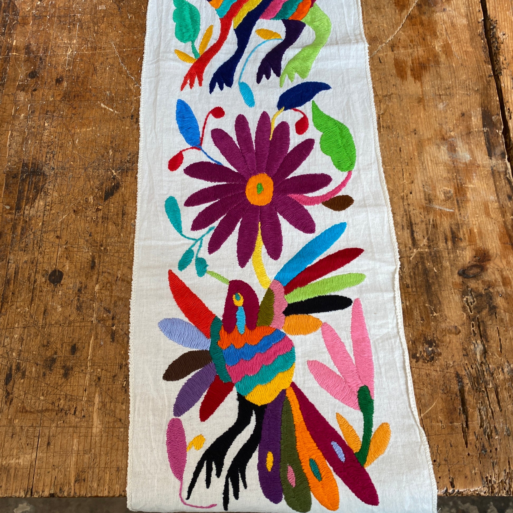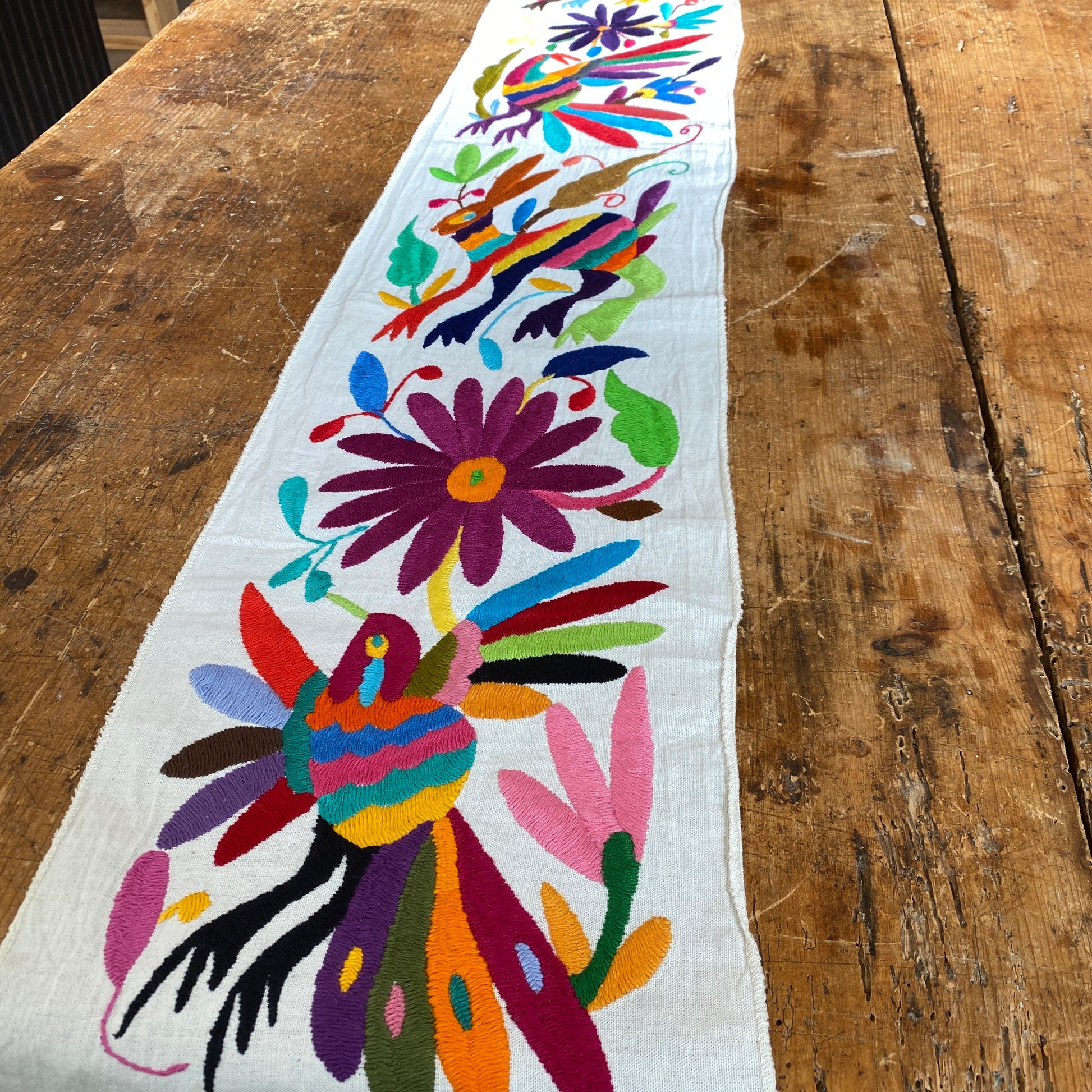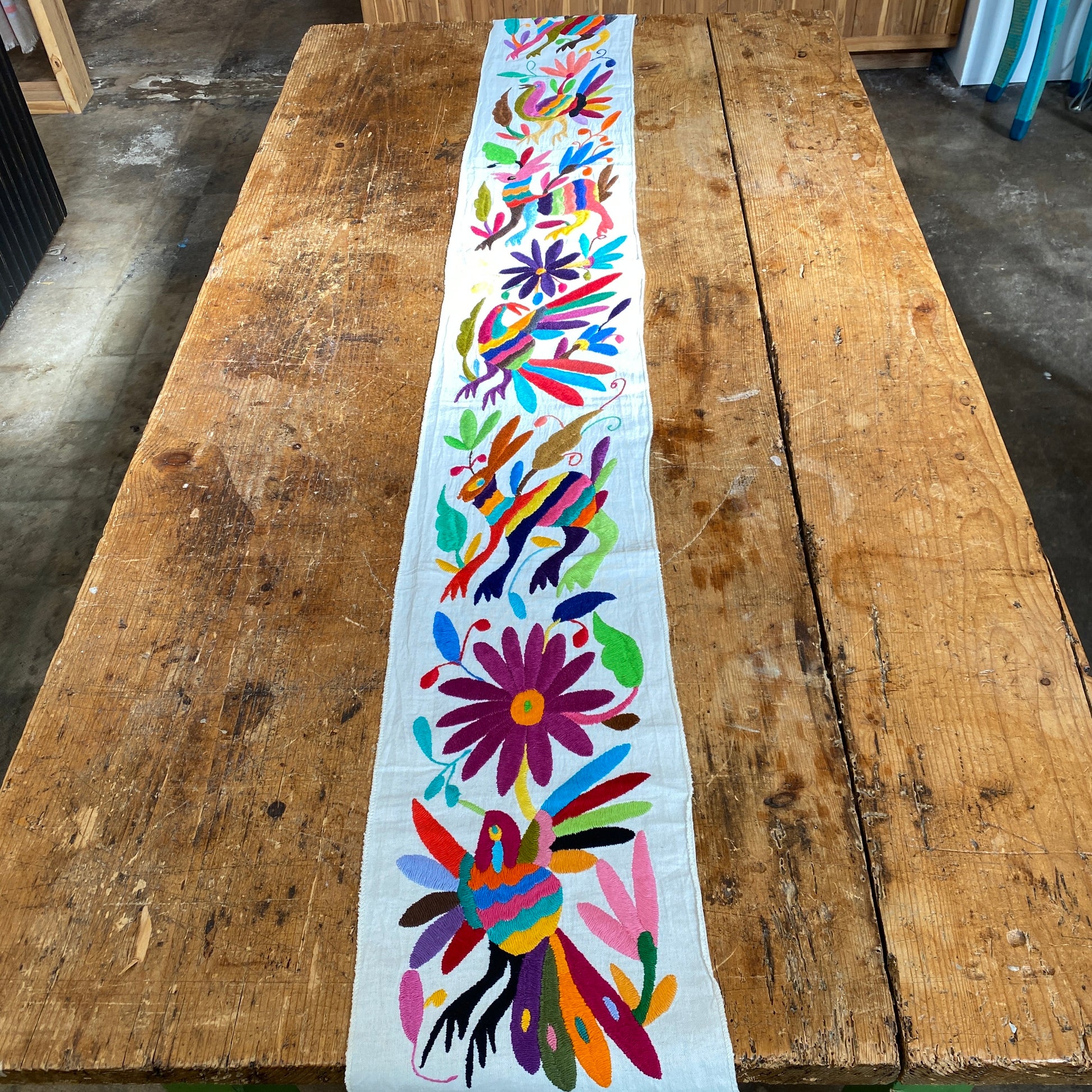Hand embroidered by the Otomis in central plateau of Mexico, these table runners feature fantastic animals, insects, and flowers. This type of embroidery on cotton is highly coveted by lovers of Mexican art for their exuberant colors and highly imaginative design. Popularly called "Otomi" after their creators, no two embroideries are alike and can take months to finish. These table runners measure approximately 8" x 74". Please keep in mind that each runner is handmade and unique and can vary in size and design.