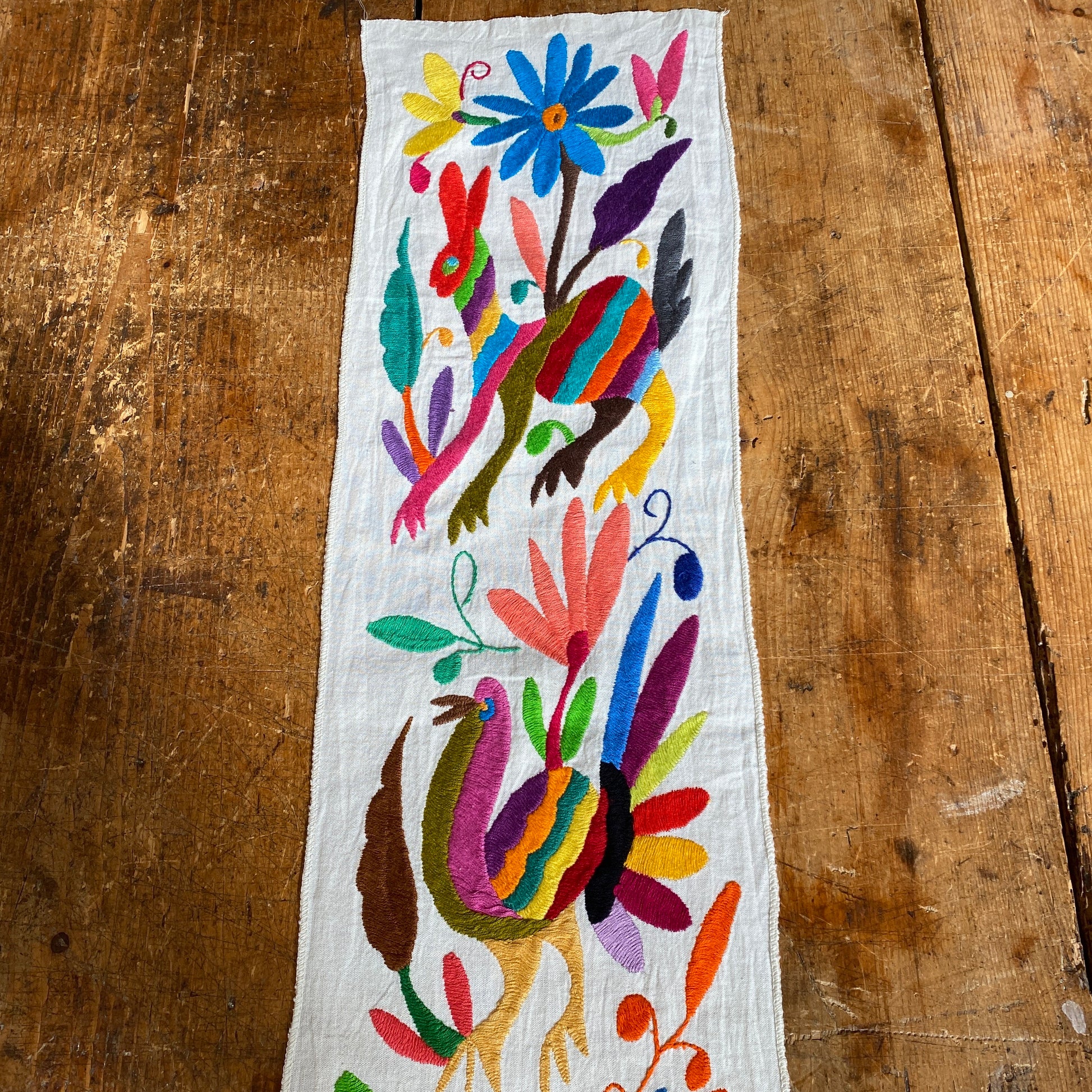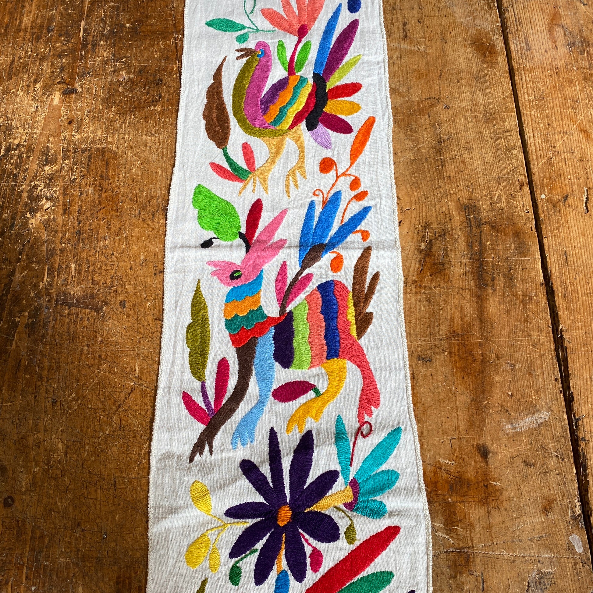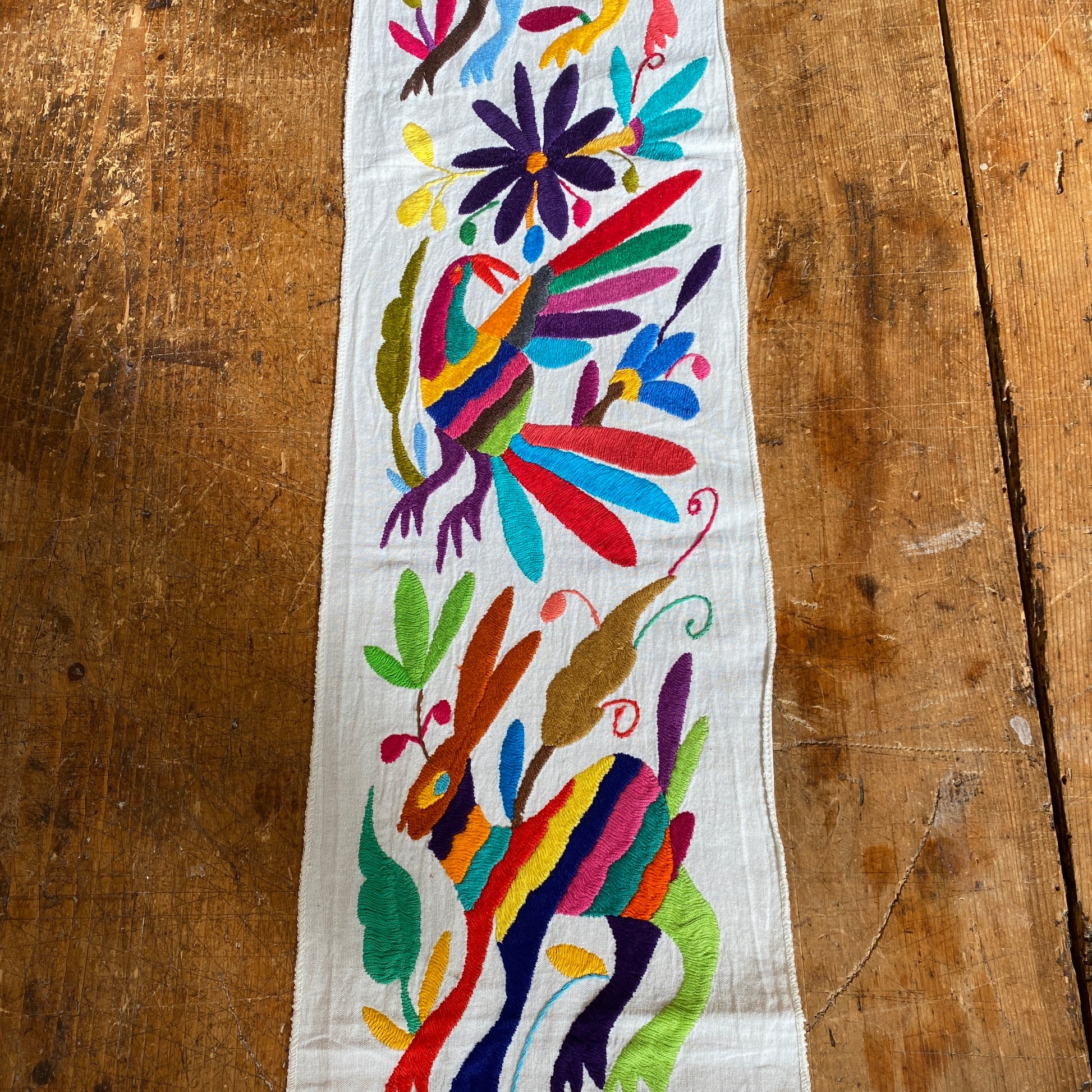 Hand embroidered by the Otomis in central plateau of Mexico, these table runners feature fantastic animals, insects, and flowers. This type of embroidery on cotton is highly coveted by lovers of Mexican art for their exuberant colors and highly imaginative design. Popularly called "Otomi" after their creators, no two embroideries are alike and can take months to finish. These table runners measure approximately 8" x 74". Please keep in mind that each runner is handmade and unique and can vary in size and design.