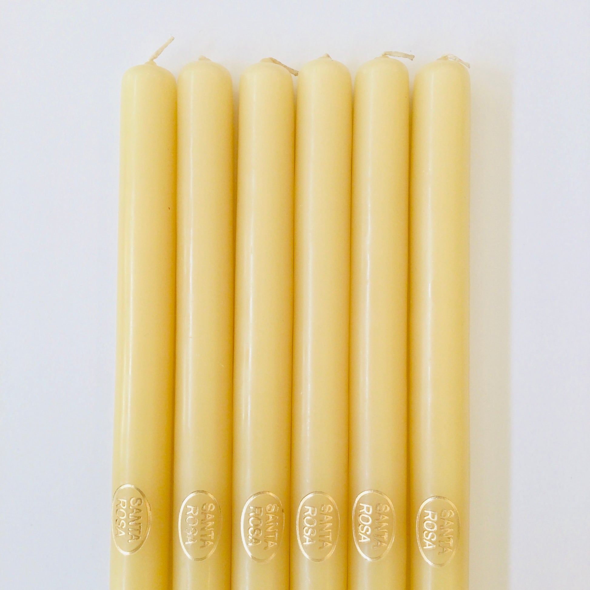 These well renowned Santa Rosa candles were originally made to grace the altars in churches and in the homes of Mexico. Taking from a decades long tradition, each candle is meticulously hand dipped one layer at a time in paraffin wax by skilled local artisans. The candles are then stamped with the iconic gold Santa Rosa label. Each candle is created uniquely and may vary slightly in shape and color. We recommend using these candles in candleholders or on candle plates, as they are not dripless. Santa Rosa candles are perfect for rustic settings and creating ambiance for any occasion!